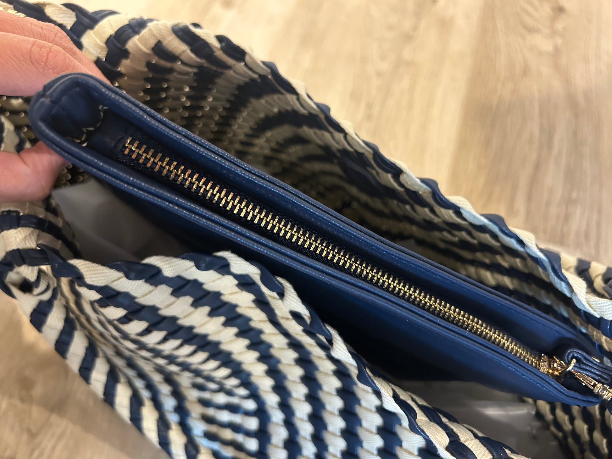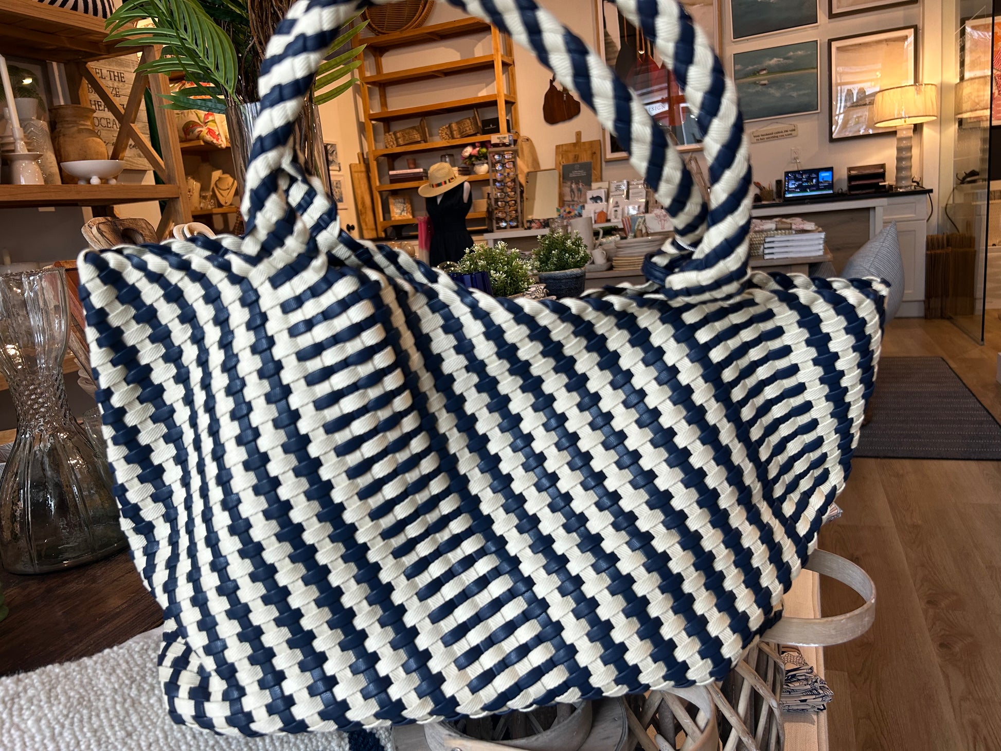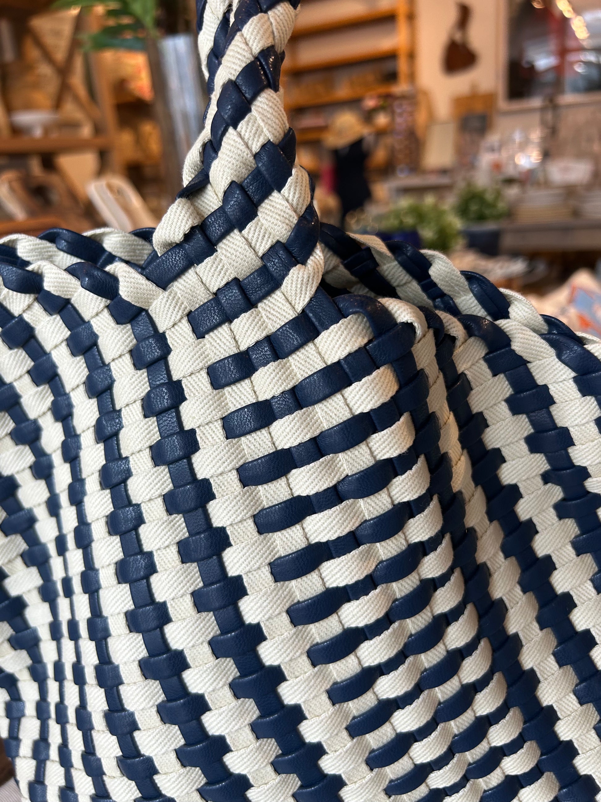 Check out this navy and white beauty. Leather and canvas woven together to create a sturdy and stunning everyday bag. AND it comes with a navy leather bag inside with gold zipper for your smaller items! We love her and we know you will too!